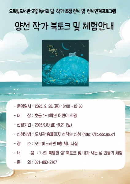 초등 1~3학년을 대상으로 그림책 함께 읽기, 작가와의 질의응답, ‘내가 사는 섬 만들기’ 체험 활동이 진행돼 어린이들이 직접 창의력을 발휘할 수 있는 기회를 제공한다.