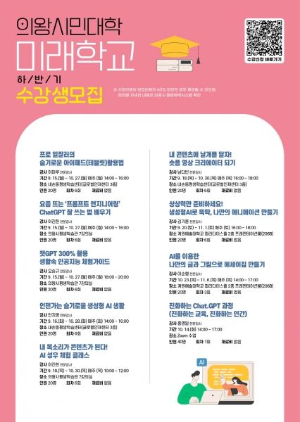이번 하반기 강좌에는 △챗지피티 잘 쓰는 법 배우기 △생활 속 인공지능 체험 가이드 △인공지능으로 만드는 나만의 에세이집 △숏폼 영상 크리에이터 되기 △ 아이패드 활용법 △생성형 인공지능 생활 등의 인공지능 및 디지털 활용 기술을 실생활과 접목할 수 있는 프로그램이 다채롭게 개설돼 있다.