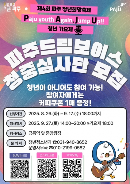 [금요저널] 파주시는 ‘청년의 날’을 맞이해 오는 27일 금릉역 앞 중앙광장에서 개최되는 ‘제4회 파주 청년희망축제’의 핵심 프로그램인 청년가요제 ‘파주드림보이스’ 참가자 모집을 마치고 본선 진출자 선발을 완료했다고 밝혔다.