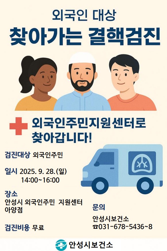 [금요저널] 안성시보건소는 의료접근성이 낮은 외국인 주민에게 결핵 검진의 기회를 제공하기 위해 2025년 9월 28일 오후 2시부터 4시까지, 외국인주민지원센터에서 ‘찾아가는 결핵 검진’을 무료로 실시한다고 밝혔다.