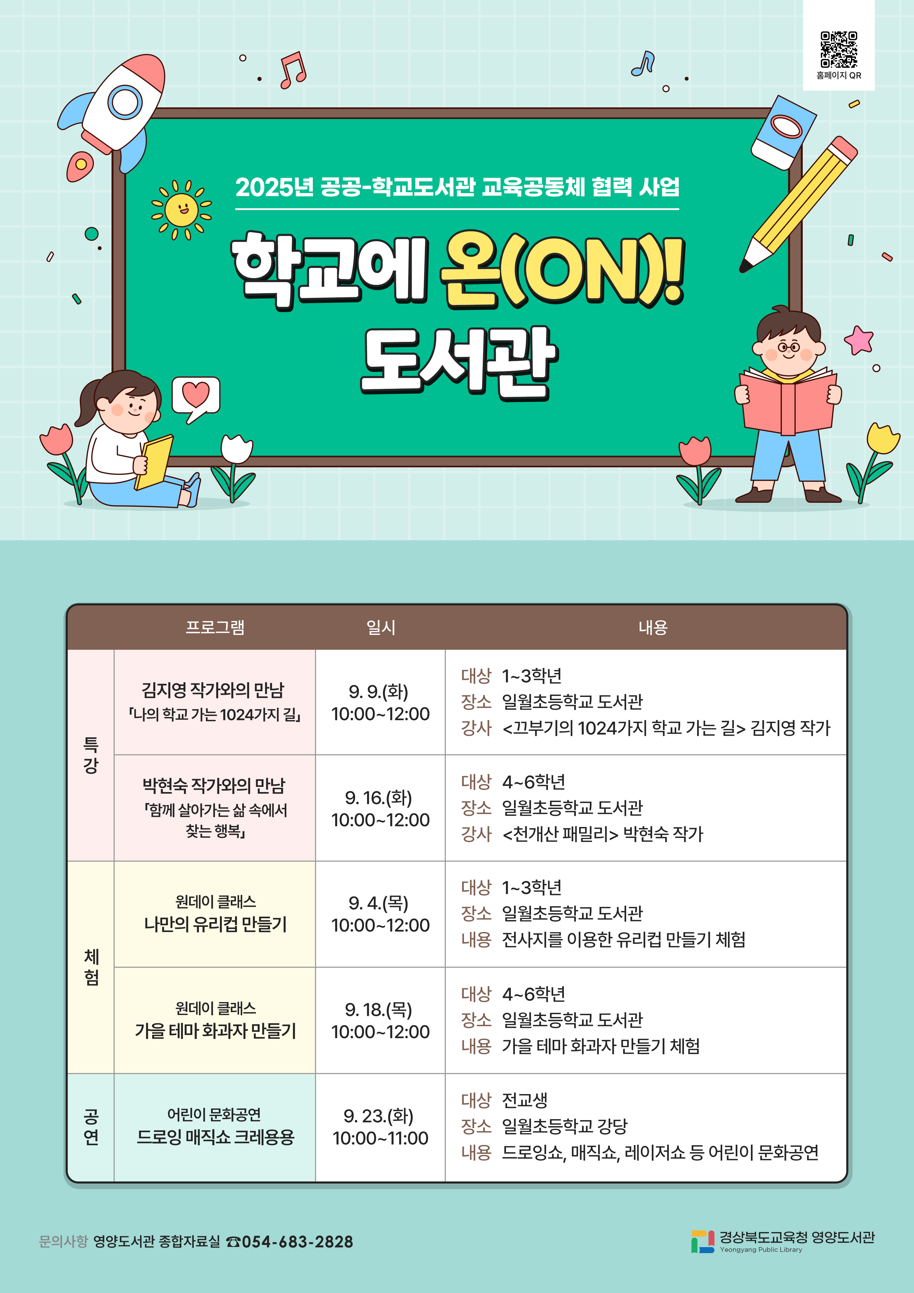 □ 경상북도교육청 영양도서관(관장 우승희)은 공공도서관과 학교도서관의 연계를 통해 도서관 이용 활성화와 독서문화진흥을 도모하고자 공공-학교도서관 교육공동체 협력 사업 「학교에 온(ON)! 도서관」 프로그램을 운영한다.