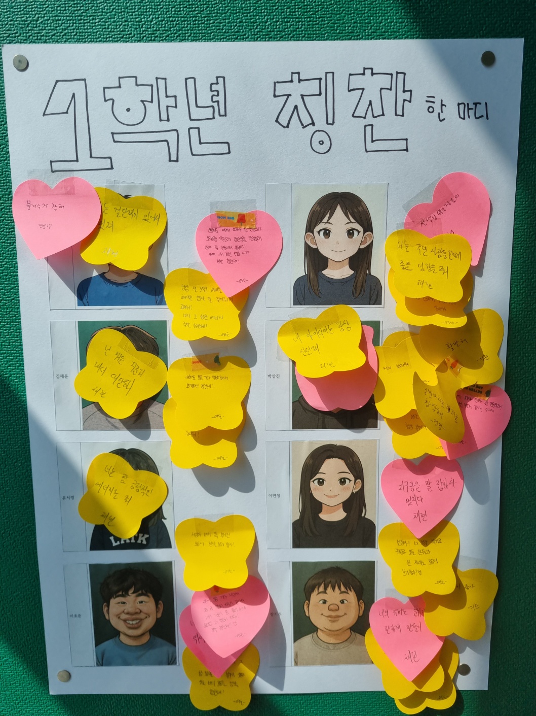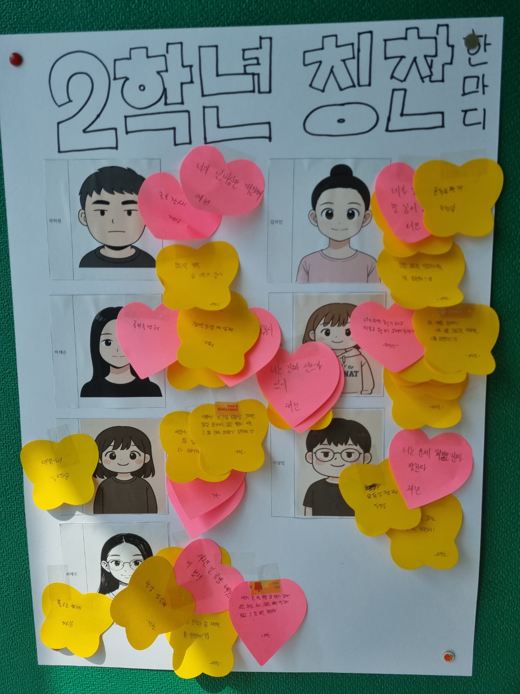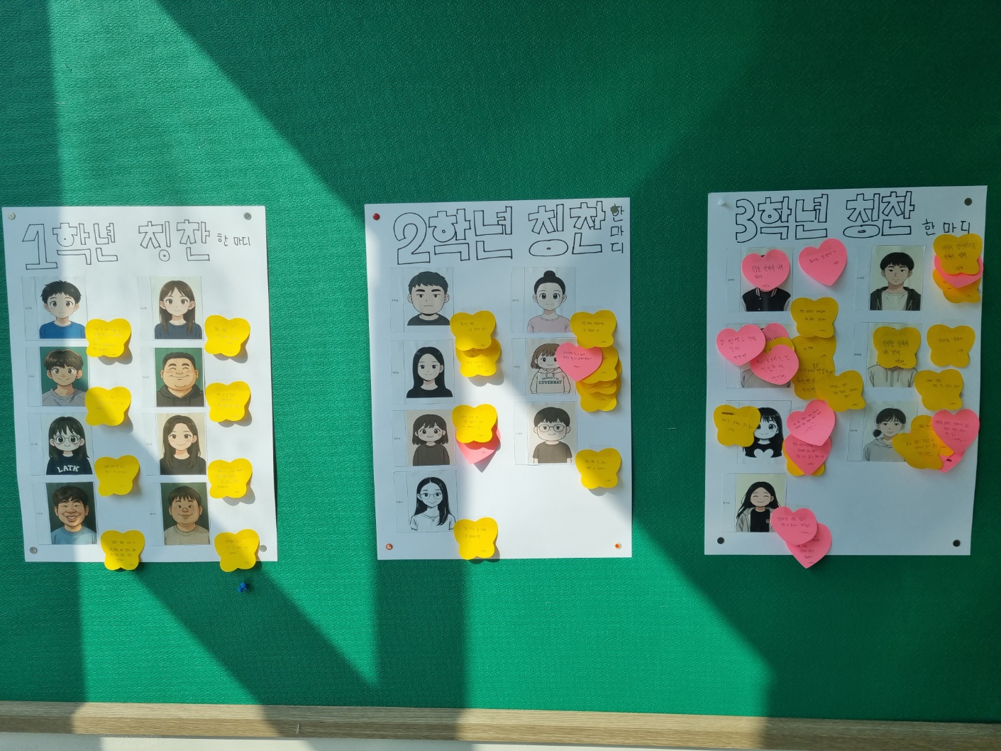 □ 학생들은 쉬는 시간과 점심 시간에 복도 게시판에 칭찬 글을 작성해 붙이고 있으며, 친구뿐만 아니라 자신에게도 따뜻한 말을 전할 수 있도록 하고 있다. 특히 스스로에게 칭찬을 남기도록 장려하여 자기 긍정과 자존감을 높일 수 있는 기회를 제공하고 있다.