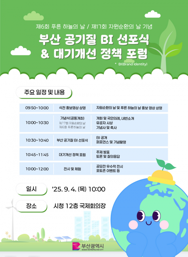 공동 기념식은 시청 12층 국제회의장에서 오전 10시에 개최되며 △부산 공기질 브랜드 선포식 △유공자 표창 △시민 체험 공모전 시상 △대기 개선 정책 토론회이 진행된다.
