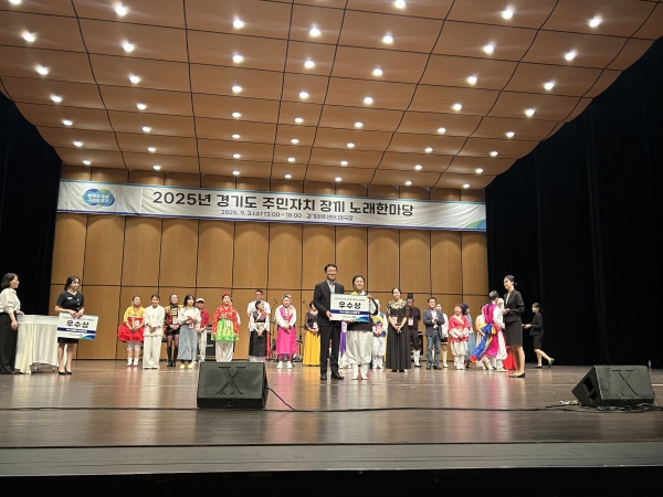 [금요저널] 시흥시는 지난 9월 3일 수원 경기아트센터 대극장에서 열린 ‘2025년 경기도 주민자치 장끼한마당’에서 목감동 주민자치센터 프로그램 대표 팀인 ‘목감풍물단’ 이 우수상을 받았다고 밝혔다.