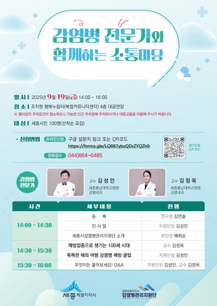 [금요저널] 세종시 감염병관리지원단이 오는 19일 오후 2시 조치원 행복누림터 4층 대공연장에서 ‘2025년 감염병 전문가와 함께하는 소통마당’을 개최한다.