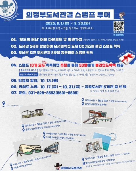 ‘의정부도서관길 스탬프 투어’는 9월 한 달간 5곳의 의정부시 공공도서관과 도서관 주변 걷기 좋은 길 5곳을 연계해 진행하는 체험형 독서문화 진흥 행사다.