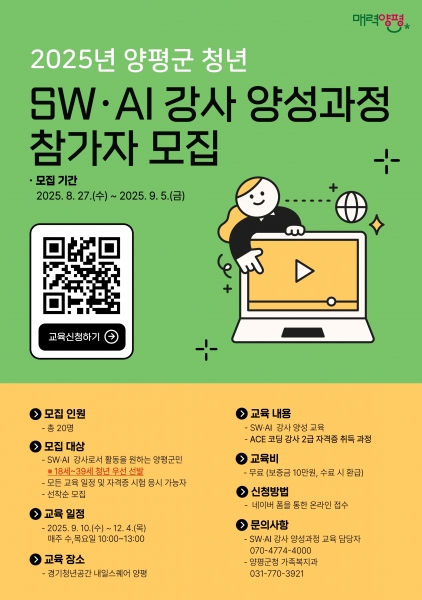 [금요저널] 양평군은 청년들의 디지털 역량 강화를 통해 미래형 일자리 진입을 지원하고자, ‘2025년 양평군 청년 소프트웨어·인공지능 강사 양성과정’을 9월부터 본격적으로 운영한다고 밝혔다.