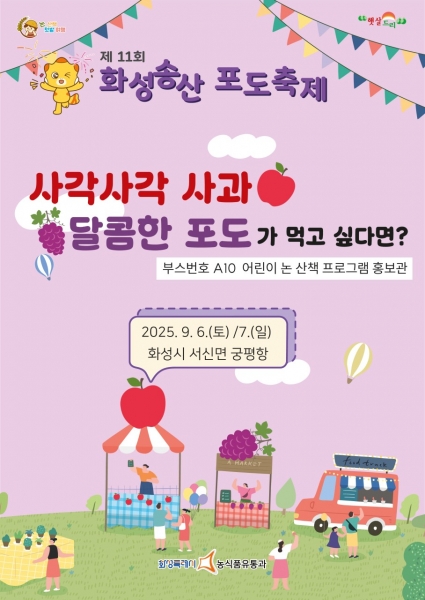 [금요저널] 화성특례시가 오는 6일부터 7일부터 이틀간 제11회 화성송산포도축제에서 ‘사각사각 사과, 달콤한 포도가 먹고 싶다면? 구수한 밥이 먹고 싶다면?’을 주제로 ‘제10회 고사리 손 그림전시회 특별전’을 운영한다.