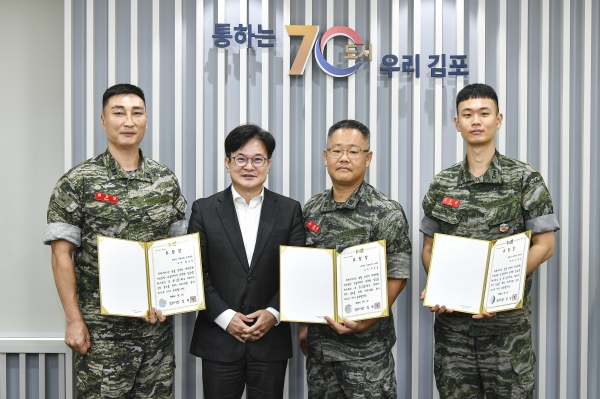 이날 시청 소통실에서 진행된 표창 수여식에는 표창 대상자 해병대 제2사단 소속 부대원 강유준, 유정환, 한호성 유공자 3명이 수여받았다.