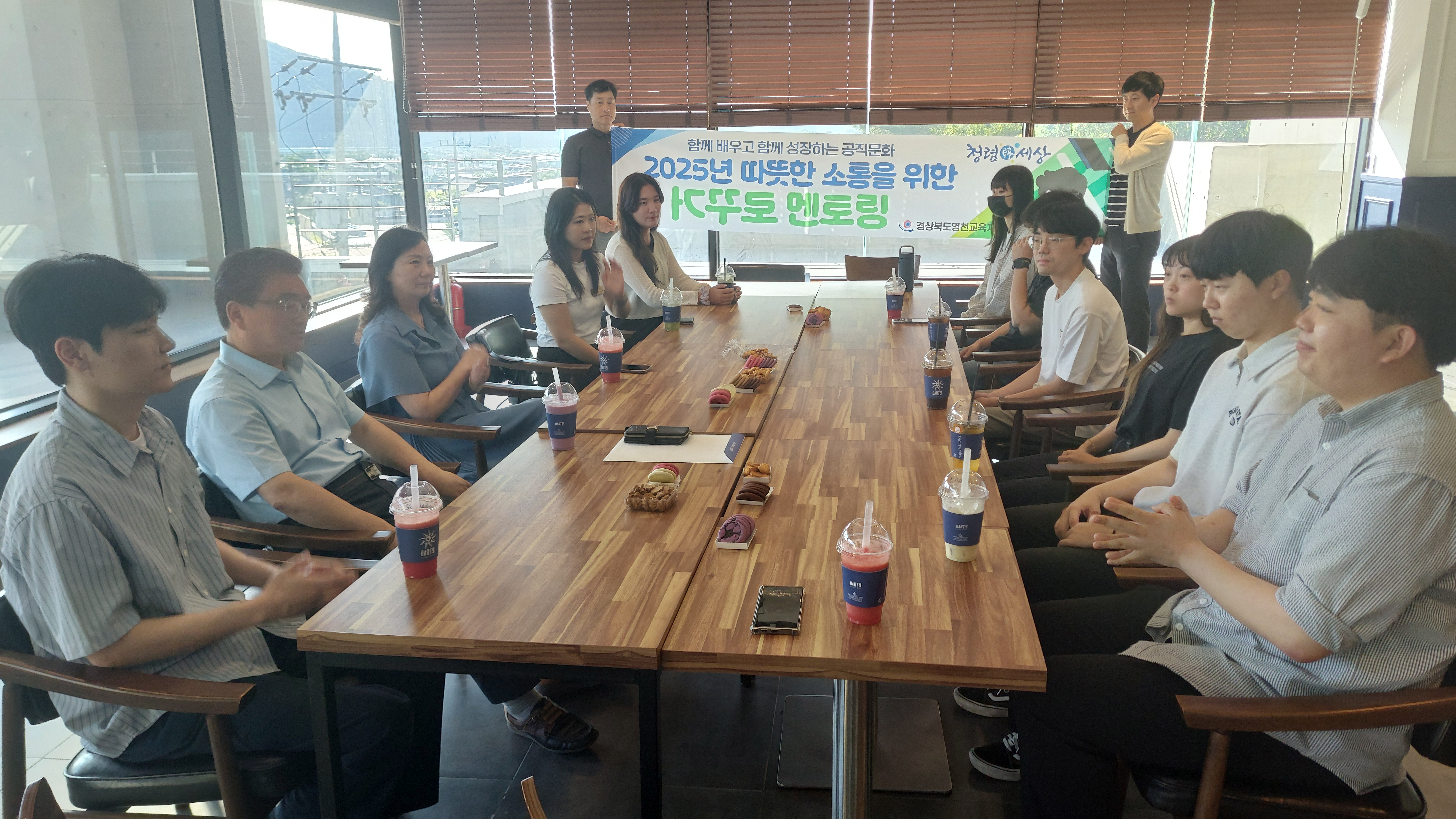 경상북도영천교육지원청(교육장 신봉자)은 2025년 9월 3일(수), 관내 카페에서 ‘거꾸로멘토링’ 정기멘토링 행사를 진행하였다. 이번 행사에는 교육장과 교육지원과장, 행정지원과장, 그리고 멘토 9명이 참석하여 세대 간 이해를 높이고 조직 문화 개선을 위한 의미 있는 시간을 가졌다.