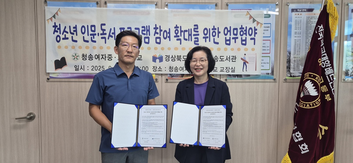 경상북도교육청 청송도서관(관장 김미연)은 9월 4일(목) 청송여자중·고등학교와 협력하여, 2025년 인문학 아카데미 사업「너의 길을 응원해! 진로 멘토링 특강」운영을 위한 업무협약(MOU)을 체결했다.