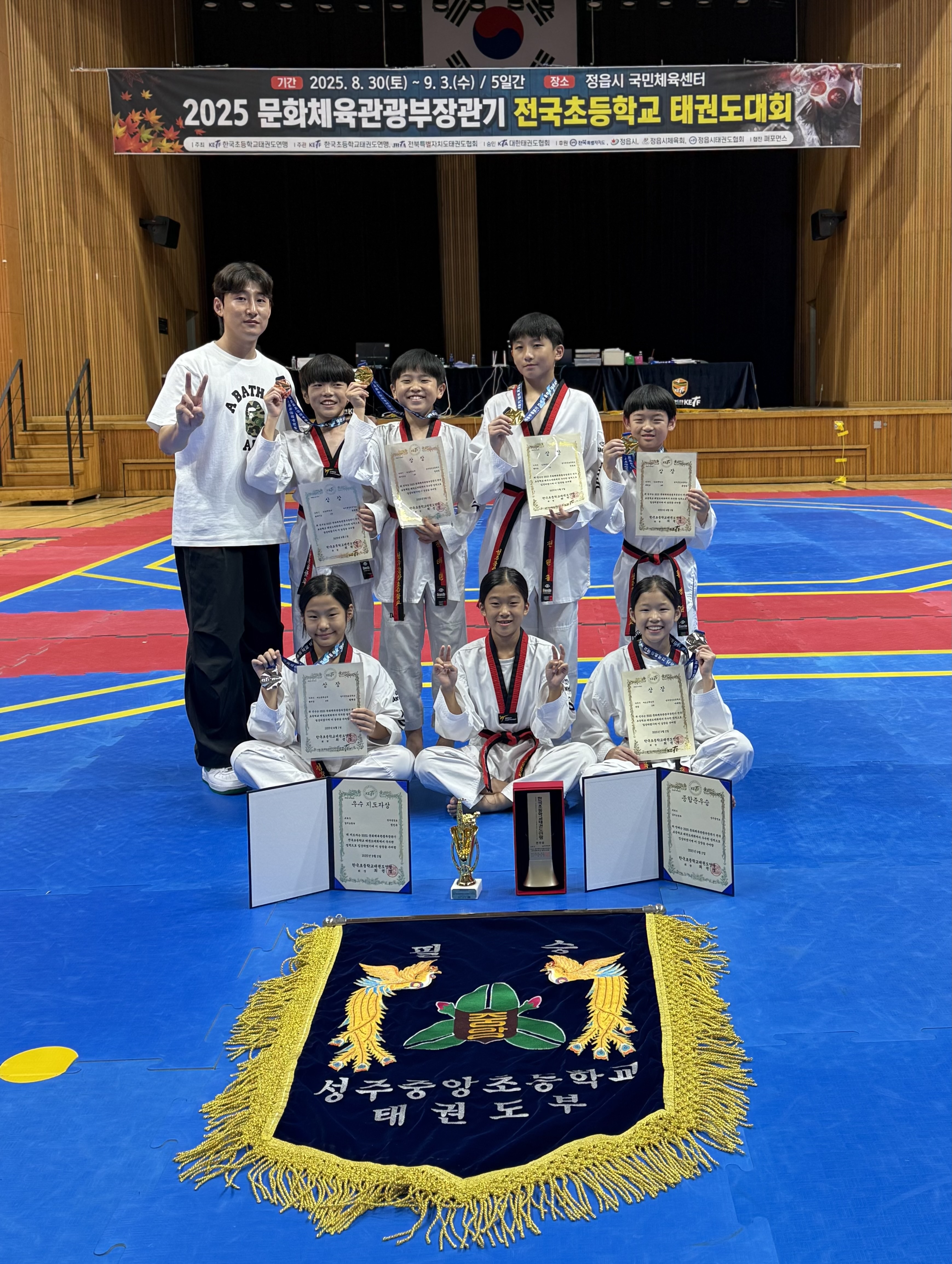 □ 성주중앙초등학교(교장 김동섭)는 8월 31일부터 9월 2일까지 전북 정읍시 국민체육센터에서 열린 2025 문화체육관광부장관기 전국초등학교태권도대회에서 총 7명의 선수가 출전해 6명이 입상, 남초부 종합준우승과 함께 우수지도자상까지 수상하는 쾌거를 이뤘다고 밝혔다.