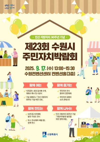 수원시 관계자는 “지방자치 30주년의 의미를 되새기며 주민자치의 성과와 가치를 공유하는 박람회”며 “시민이 주인인 자치문화를 함께 만들어가는 계기가 되길 바란다”고 말했다.