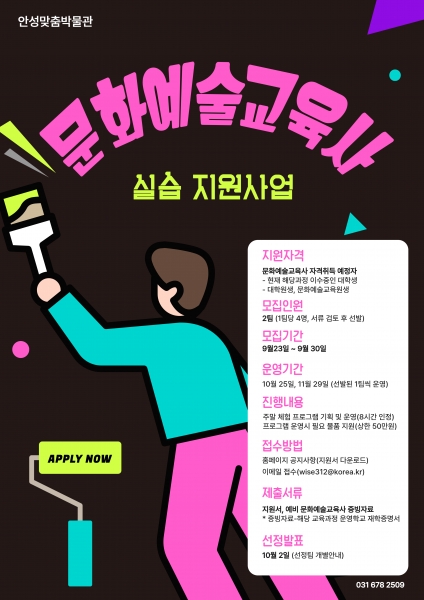[금요저널] 안성시 안성맞춤박물관은‘2025년 문화예술교육사 실습 지원사업’ 추진을 위해 오는 9월 23일부터 9월 31일까지 실습생을 모집한다.