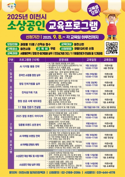 [금요저널] 이천시(시장 김경희)는 예비 창업자와 초기 소상공인을 대상으로 한 ‘2025년 하반기 소상공인 교육프로그램’ 교육생을 모집한다.