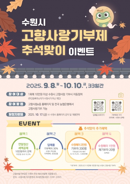 [금요저널] 수원시는 8일부터 10월 10일까지 33일간 ‘수원시 고향사랑기부제, 추석맞이 감사이벤트’를 연다.