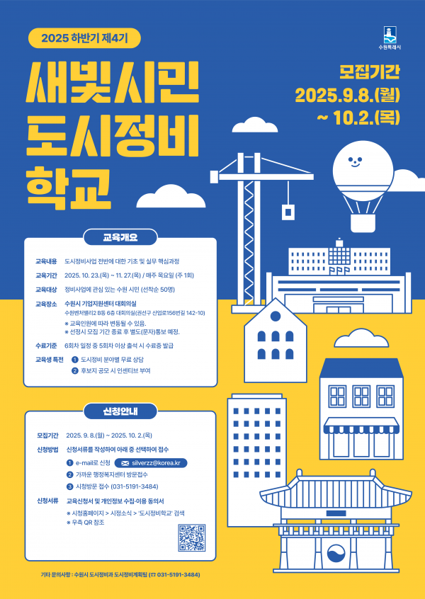 [금요저널] 수원시가 도시정비 시민 전문가를 양성하는 ‘새빛시민 도시정비학교’ 제4기 교육생을 9월 8일부터 10월 2일까지 모집한다.