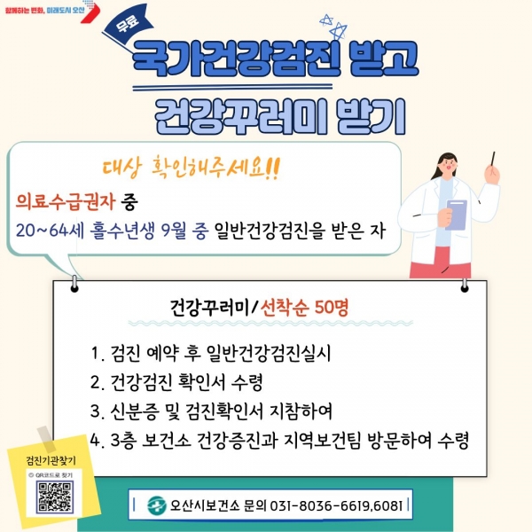 [금요저널] 오산시는 오산시보건소에서 의료급여수급권자의 건강권 보장을 위해 만 20세에서 64세 사이 홀수년도 출생자를 대상으로 하는 국가건강검진 참여를 적극 독려한다고 밝혔다.