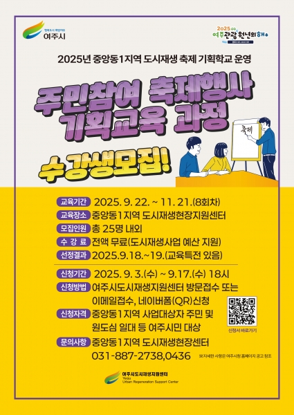 [금요저널] 여주시는 중앙동1지역 도시재생 뉴딜사업으로 일환으로 추진되는 ‘2025년 중앙동1지역 축제 행사 기획학교’를 이달 22일부터 운영한다고 밝혔다.