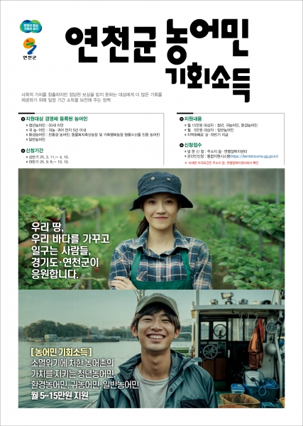 경기도 연천군 농어민 기회소득 지원사업은 농어업·농어촌의 소멸 위기에 대응해 공익적 기능을 유지, 지속하는 등 사회적 가치 창출 활동에 대한 정당한 보상으로 미래에 투자하는 농어민을 지원하기 위한 정책사업이다.