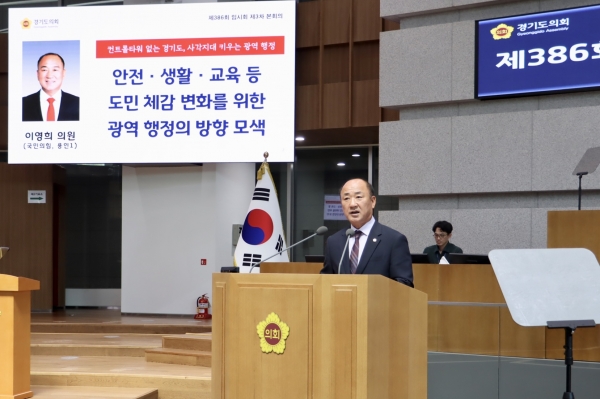 [금요저널] 경기도의회 이영희 의원은 9일 열린 제386회 임시회 제3차 본회의 도정질문에서 “전국 최대 규모의 군부대가 주둔한 경기도가 군 협력의 최적 조건을 갖추고도 실질적 컨트롤타워 부재로 수많은 기회를 놓치고 있다”며 강하게 질타했다.