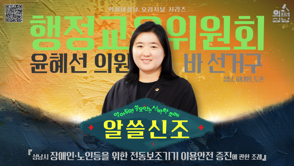 이번에 소개하는 조례는 윤혜선 의원 등 19명이 공동 발의한 ‘성남시 장애인·노인 등을 위한 전동보조기기 이용 안전 증진에 관한 조례’ 이다.