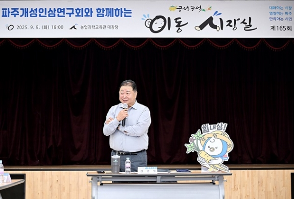 이날 이동시장실에서는 파주의 대표 특산물인 파주개성인삼을 재배하는 파주개성인삼연구회장 등 연구회원 20여명이 참여한 가운데, 올여름 폭염과 고온으로 인한 농가의 고충을 청취하고 나날이 극심해지고 있는 기후 위기에도 높은 품질의 인삼을 재배할 수 있는 기반 마련을 위한 대책을 논의했다.