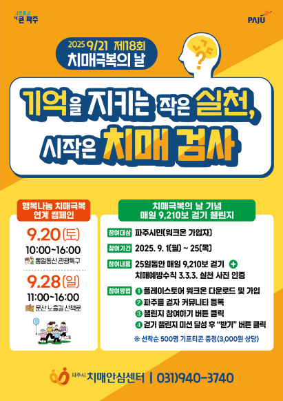 치매극복의 날은 치매에 대한 사회적 관심을 높이고 치매 관리의 중요성을 알리기 위해 제정된 법정기념일로 파주시는 ‘기억을 지키는 작은 실천, 시작은 치매 검사’를 표어로 정하고 시민 인식 개선에 나선다.