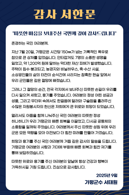 또한 “멀리서도 아픔을 함께 나눠준 국민 여러분의 정성 하나하나가 가평군의 빠른 회복을 이끌었다”며 “이웃과 공동체의 소중함을 다시금 일깨워 줬다”고 덧붙였다.