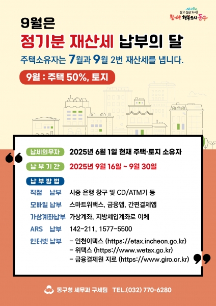 [금요저널] 인천 동구는 관내 주택소유자 등에게 2025년도 제2기분 재산세 108억원을 부과했다고 밝혔다.