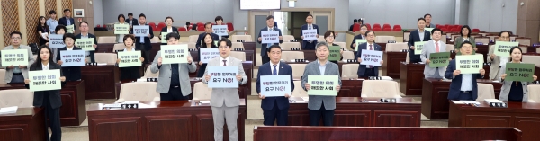 이번 캠페인은 청렴한 의정활동을 실천하고 투명한 조직문화를 확산하기 위해 마련된 자리로 의원들은 ‘투명한 의회, 깨끗한 사회’, ‘부당한 업무처리 요구 NO’ 문구가 적힌 손 피켓과 카드섹션 퍼포먼스를 펼치며 청렴 의지를 다졌다.