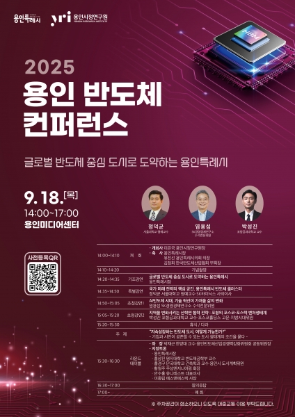 [금요저널] 용인특례시는 재단법인 용인시정연구원과 함께 18일 오후 2시 용인미디어센터에서 ‘2025 용인 반도체 컨퍼런스’를 연다고 11일 밝혔다.