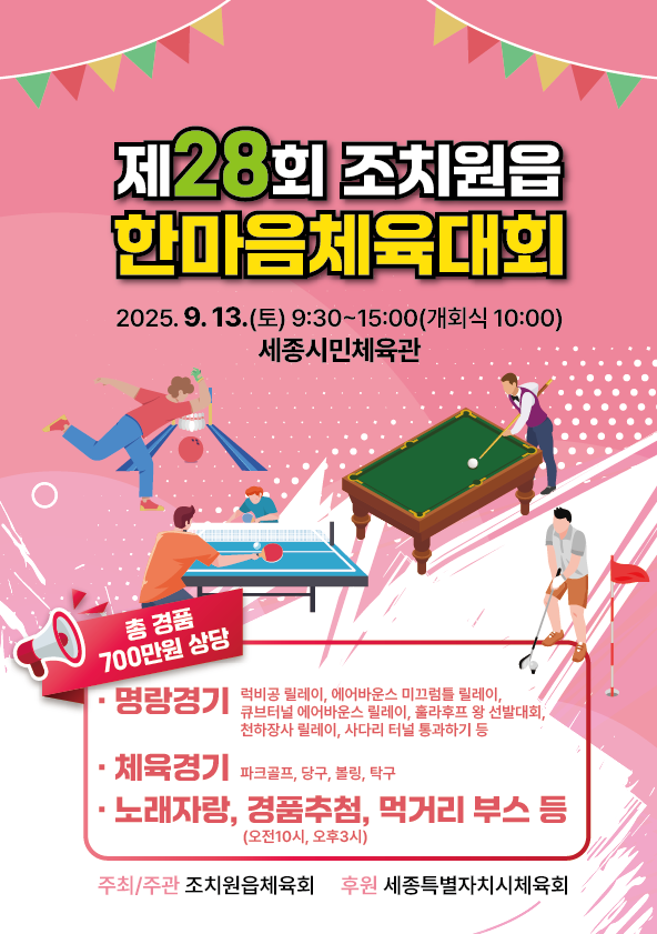 [금요저널] 세종시 조치원읍체육회가 오는 13일 조치원읍 세종시민체육관에서 ‘제28회 조치원읍 한마음 체육대회’를 개최한다.