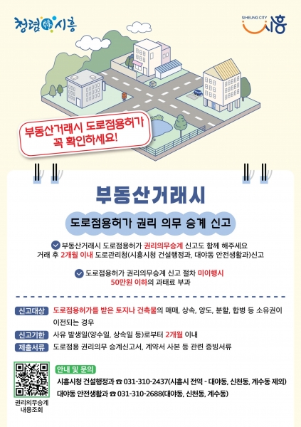 [금요저널] 시흥시는 부동산 매매 시 ‘도로점용허가 권리·의무 승계 신고’ 절차 누락으로 거래자 간 불이익이 발생하는 사례가 발생하고 있다며 부동산 거래 당사자 및 중개업계에 각별한 주의를 당부하고 적극 홍보에 나섰다.