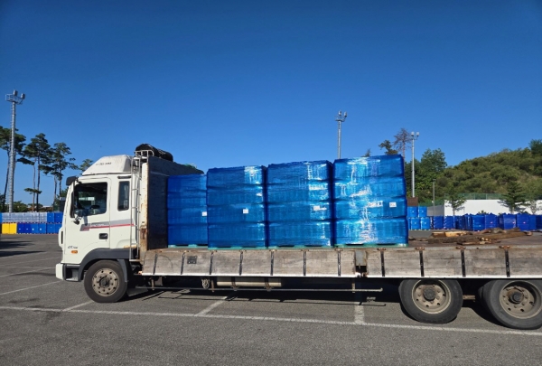 (사)수원산업단지관리공단이 기부한 생수를 실은 트럭이 현지에 도착한 모습.