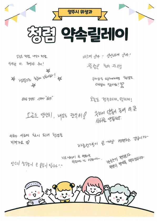 위생과 전직원은 함께 작성한 메시지를 공유하며 청렴 실천 의지를 다지고 일상 속에서 청렴 가치를 지켜나갈 것을 다짐하는 시간을 가졌다.