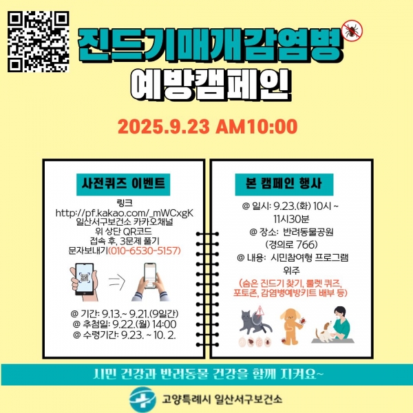 또한 사전 참여 이벤트로 9월 13일부터 21일까지 일산서구보건소 카카오채널에서 ‘진드기 매개 감염병 퀴즈’를 운영한다.