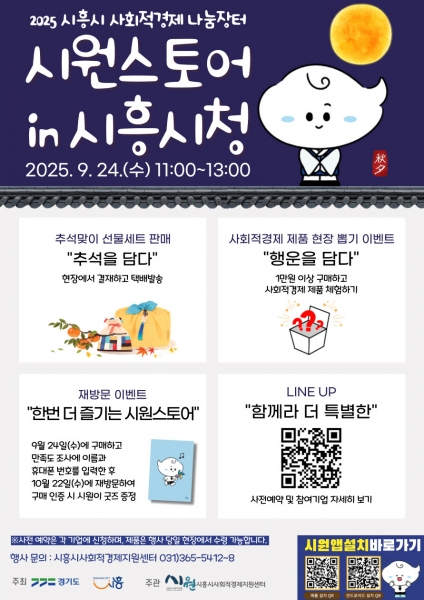 [금요저널] 시흥시는 오는 9월 24일 오전 11시부터 오후 1시까지 시흥시청 지하 1층 로비에서 시흥시 사회적경제 나눔장터 ‘시원스토어 in 시흥시청’을 개최한다.