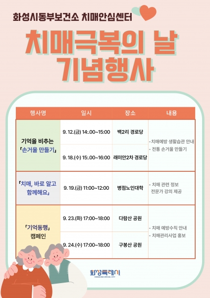 [금요저널] 화성시동부보건소가 제18회 치매극복의 날을 맞아 12일부터 24일까지 치매 예방과 인식 개선을 위한 기념행사를 운영한다.