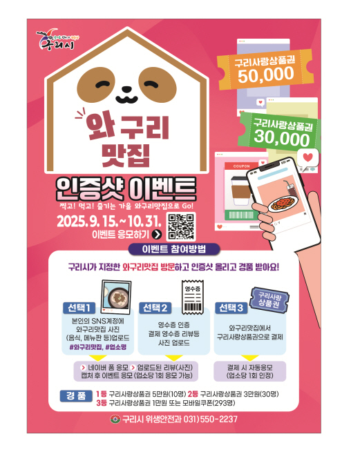 백경현 구리시장은 “이번 이벤트는 시민과 함께하는 참여형 캠페인으로 가을철 지역 음식문화 활성화에 실질적인 활력을 불어넣을 것으로 기대된다”며 “앞으로도 와구리맛집을 중심으로 구리만의 맛과 멋을 널리 알리는 다양한 정책을 추진하겠다”고 말했다.