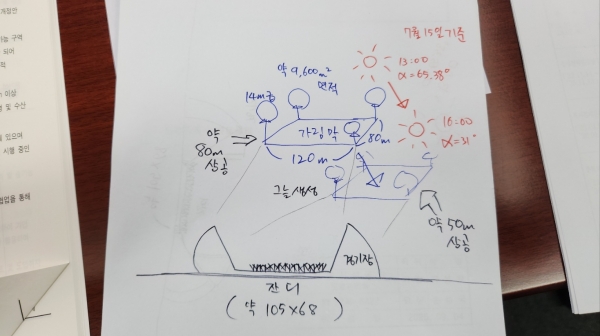 이에 태양광 직사광선이 잔디에 가해지는 것을 원천적으로 차단하기 위한 고민을 해 본 결과, 이러한 방안을 제안하게 됐다”며 공중 직사광 가림막 설치 방안의 취지에 대해 설명했다.