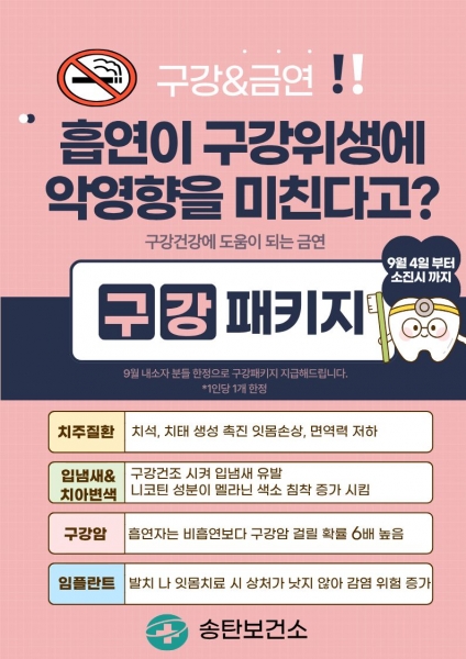 이번 사업은 흡연이 치주질환, 구강암 위험 증가, 치아 변색 및 구취 등 다양한 구강 문제의 주요 원인이라는 점에 착안해, 금연을 결심한 시민들이 구강건강까지 함께 관리할 수 있도록 마련됐다.