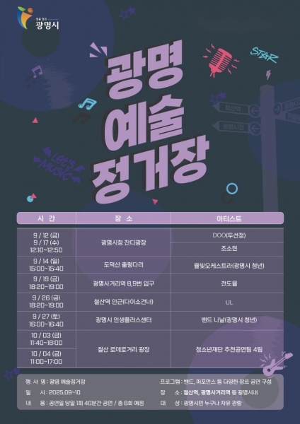 12일 광명시청 잔디광장에서 두선정의 무대를 시작으로 19일과 26일에는 광명사거리역과 철산역 인근에서 주민참여예산 사업과 연계한 거리공연이 이어진다.