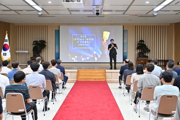 그는 ‘당신은 원칙보다 예외를 더 궁금해하는 사람인가요?’라는 주제로 드라마·뉴스 등 사례 자료를 활용해 청렴과 소통, 갑질·을질, 청탁금지법, 이해충돌방지법 등을 쉽게 풀어 설명하며 직원들의 큰 호응을 얻었다.