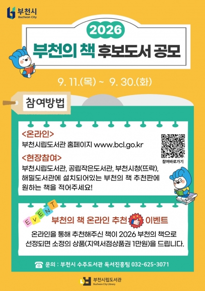[금요저널] 부천시는 9월 30일까지 ‘2026 부천의 책’ 선정을 위한 시민 추천 도서를 공모한다.
