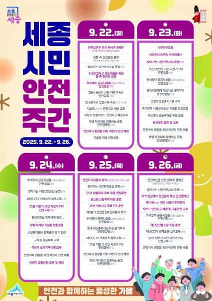 [금요저널] 세종시가 오는 22일부터 26일까지 5일간 시 전역에서 ‘2025년 하반기 세종시민 안전주간’을 운영한다.