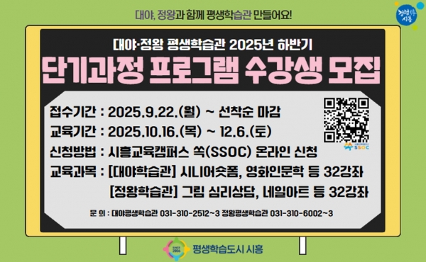 [금요저널] 시흥시 대야 · 정왕평생학습관은 오는 9월 22일부터 2025년도 하반기 단기과정 평생학습 프로그램 수강생 모집을 시작한다.