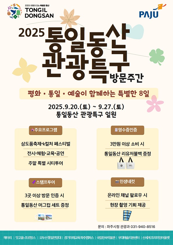 [금요저널] 파주시는 오는 9월 20일부터 27일까지 8일간 통일동산 관광특구 일원에서 ‘2025년 통일동산 관광특구 방문주간’을 운영한다.