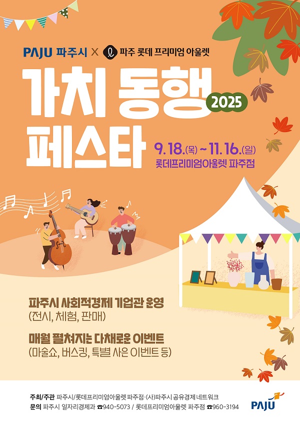 [금요저널] 파주시는 오는 9월 18일부터 11월 16일까지 롯데프리미엄아울렛 파주점에서 사회적경제기업의 판로 확대와 시민 참여형 가치 소비 문화 확산을 위한 ‘2025년 제2차 가치 동행 페스타’를 개최한다.