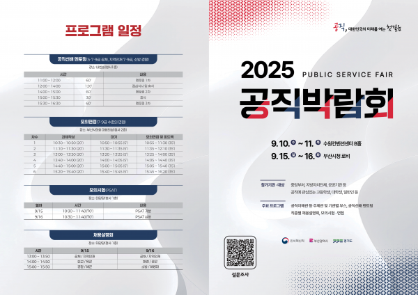 [금요저널] 공직 채용 정보를 한번에 얻을 수 있는 ‘2025 공직박람회’ 가 수원에 이어 부산에서 15~16일 이틀간 개최된다.